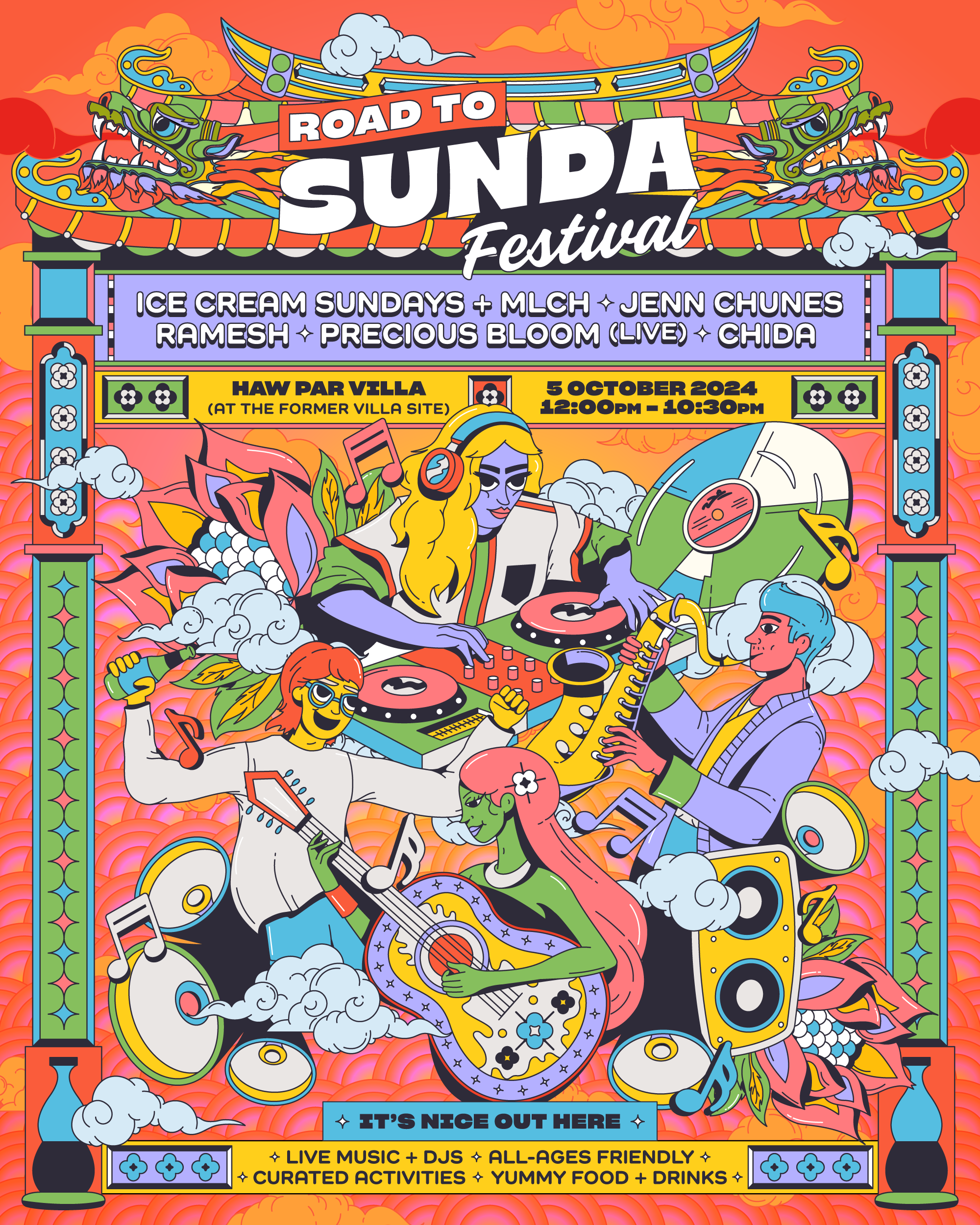 For Road to Sunda (2024), a site-responsive visual system was developed using Haw Par Villa’s architectural borders as a framing device. This system was later adapted for the main festival at Sarimbun Camp in 2025, retaining the same characters while evolving layouts and environments to suit each context. The identity supported a multi-day, multi-stage festival with numerous artists, partners, and public-facing touchpoints.