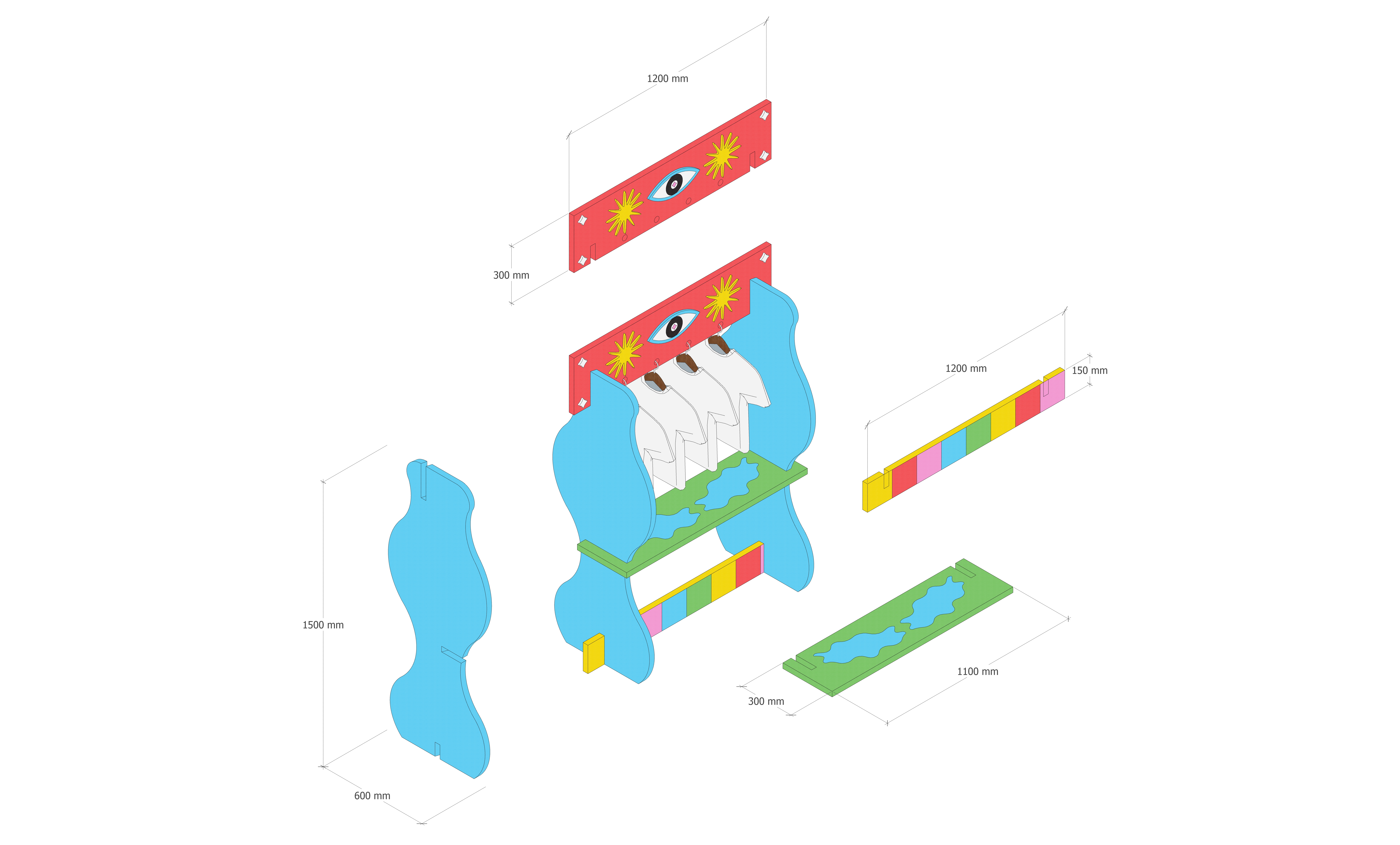 Working in collaboration with spatial designer Amirul Nazree, a modular plank system was developed to form interactive zones within the 3×3m booth. The spatial design translated the graphic language into three-dimensional forms, allowing abstract shapes to function as both display structures and playful architectural elements.